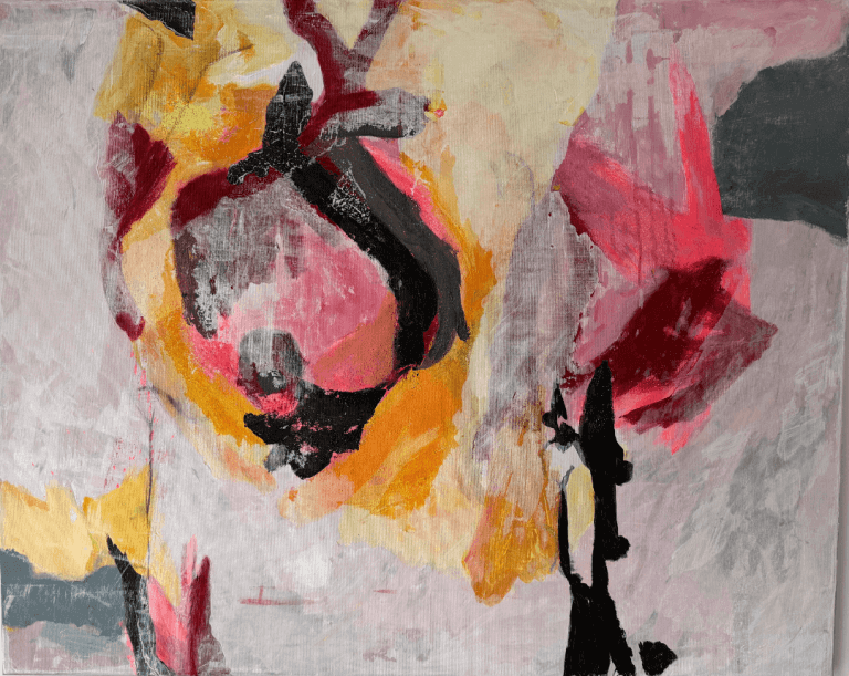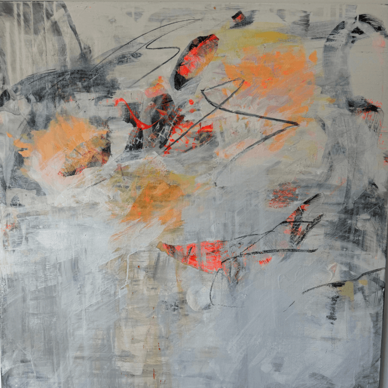 Das abstrakte Gemälde „Koi I“ ist eine helle Malerei mit hochpigmentierten Acrylfarben, vorwiegend in weiß, grau, schwarz und gelborange kombiniert mit der fluoreszierenden Tagesleuchtfarbe in Neonorange, die an manchen Stelle durchschimmert und die Aufmerksamkeit stärker auf diesen Kontrast lenkt. Zur Komposition gehören die gestischen Zeichnungen in schwarz und gelborange und sorgen so für die Spannung in dem Kunstwerk.