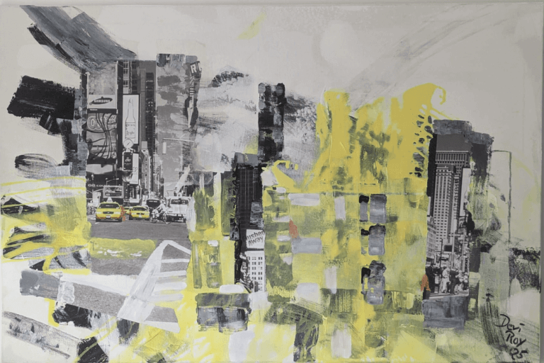 Acryl auf Leinwand, mit Papierteilen collagiert. Kontrastreiche Schwarz-Weiß-Formen treffen auf gezielte Gelb-Noten; texturierte Papierteile bringen Tiefe, als würden Gebäude und Leuchtschrift in mehreren Ebenen existieren.